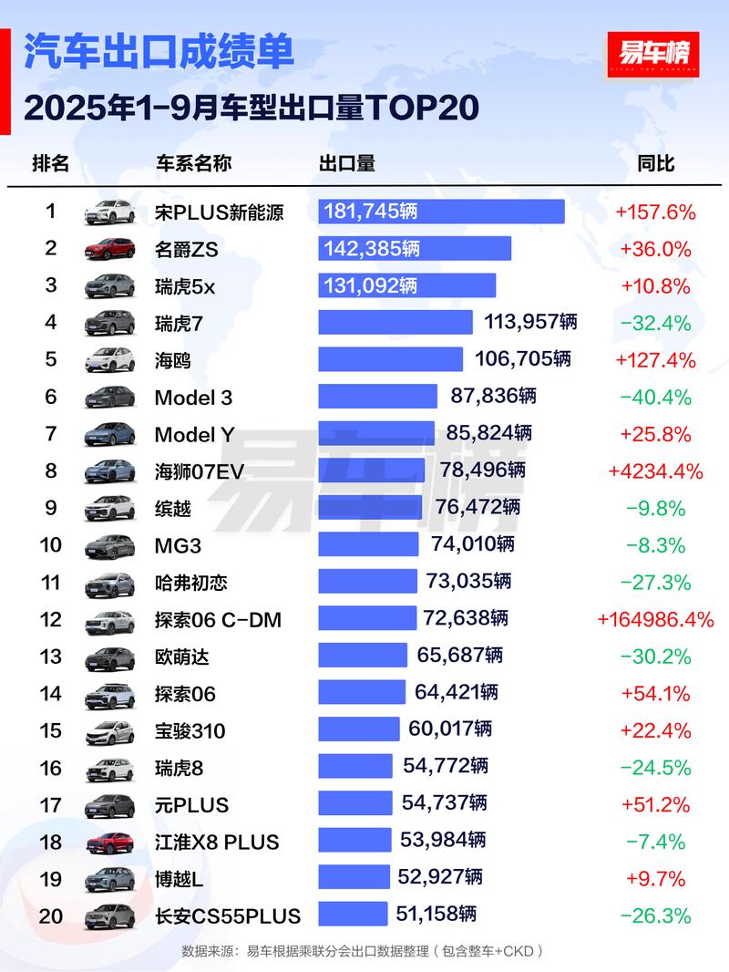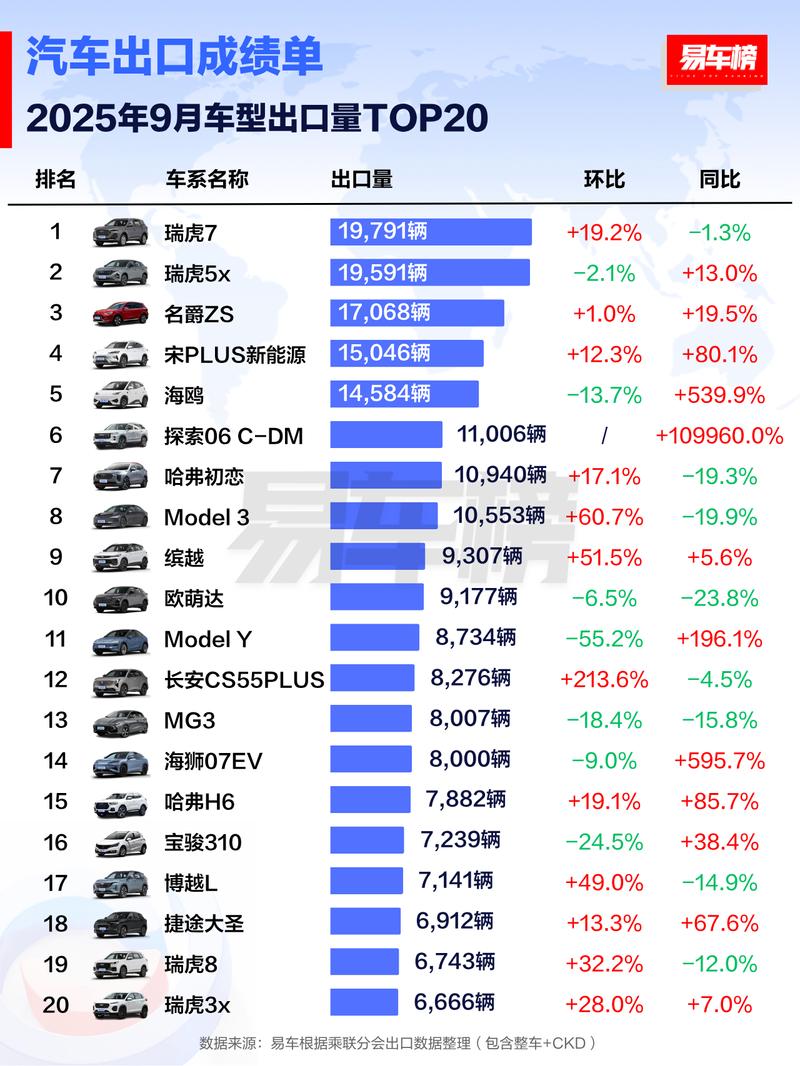 9月车型出口量前3名分别为:瑞虎7、瑞虎5x、名爵ZS;出口量分别为:19791辆、19591辆、17068辆。1-9月车型出口量前3名分别为:宋PLUS新能源、名爵ZS、瑞虎5x;出口量分别为:181745辆、142385辆、131092辆。
