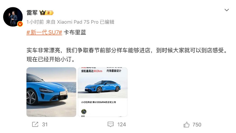 备受期待的新款小米SU7何时到店?何时上市?这个问题小米CEO雷军1月25日做了回答,他称:新款SU7的卡布里蓝配色实车非常漂亮,将争取春节前部分样车进店,方便用户感受实车。”