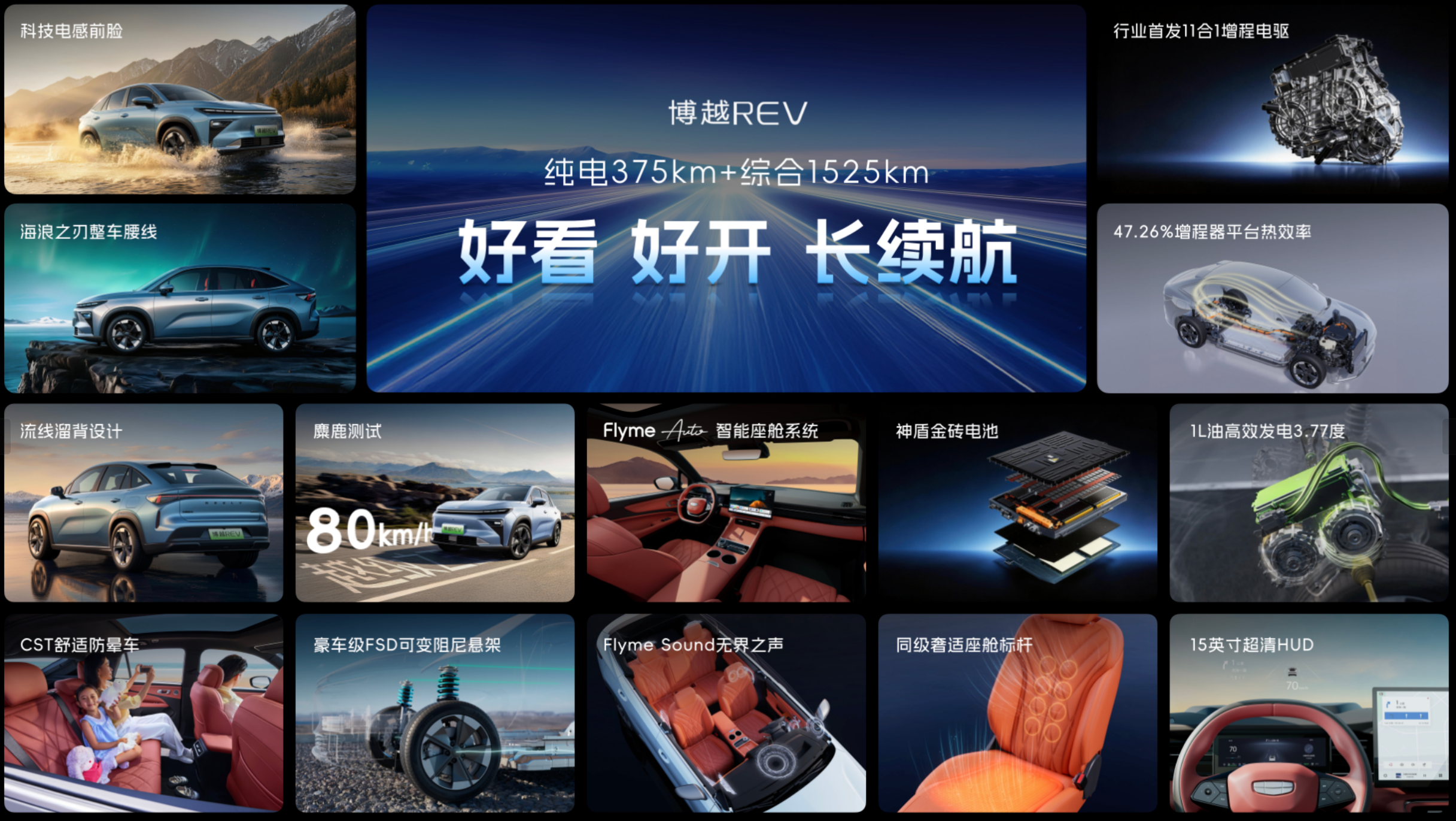 长续航是博越REV的核心竞争力,也是其区别于同级的关键。375km纯电续航、1525km综合续航,覆盖了城市通勤、短途跨城、长途出行等绝大多数家用场景,不用频繁充电,也无需担心长途补能。吉利全栈自研的超级铂金增程技术,带来了高效的油电转换和较低的馈电油耗,再加上神盾金砖电池的安全保障,让增程技术不再是“过渡选择”,而是更贴合家用的实用方案。
