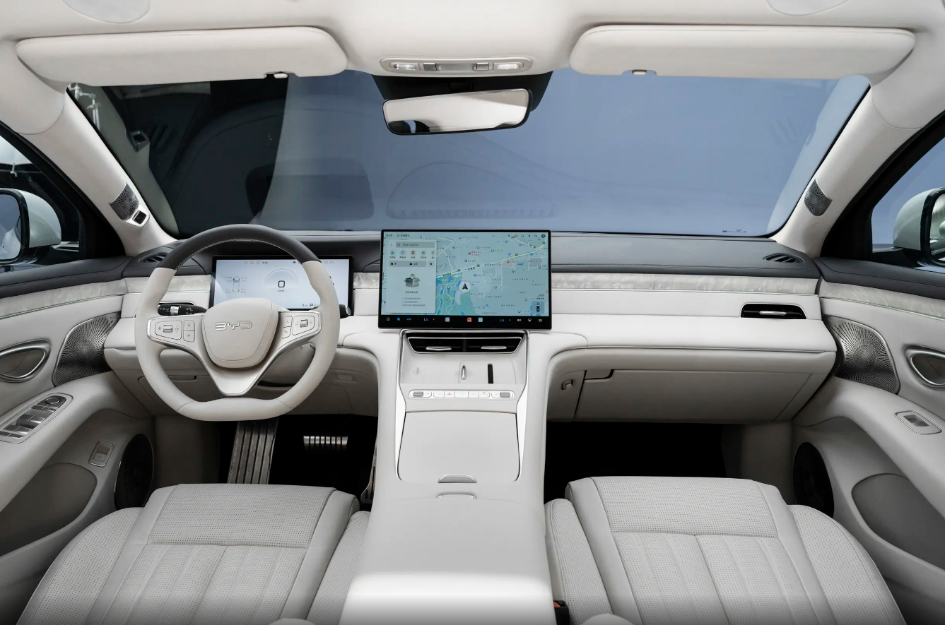 这次首发我们也终于是见到内饰,只能说中控台造型没什么惊喜,简约风格为主,一块悬浮式液晶大屏集成了所有功能操作,但令人不太理解的是,海豹08作为一款轿跑车,为什么材质应用比较偏豪华?比如看到木纹饰板和金属饰条点缀,包括配色也是更能提升高级氛围,因此年轻朋友意见比较大。可惜配置还没有什么消息,实车也只是看到后排独立空调、小桌板以及多喇叭音响系统等。