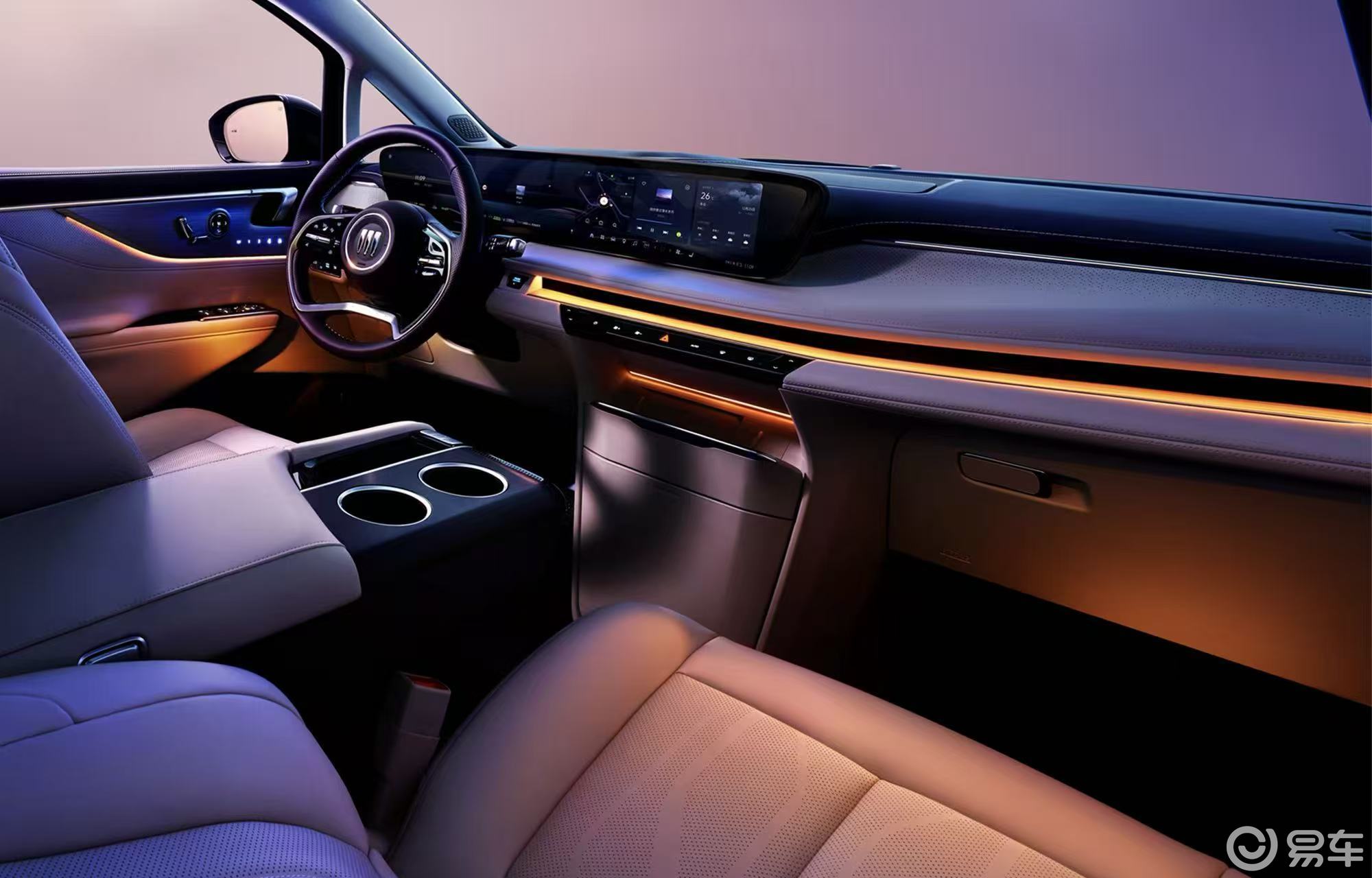 内饰方面,新款别克GL8陆尊PHEV继续搭载圆形四辐式多功能方向盘和怀挡式换挡机构,一体式悬浮曲面大屏也未有缺席。此外,新款别克GL8陆尊PHEV支持2+2+2式与2+2+3式座椅布局,提供128色艾维亚氛围灯、艾维亚银翼礼宾光毯等功能配置。