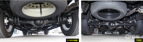 后桥减震器:D-MAX采用的是八字形斜向减震器,缓冲行程更长,能更好地抑制过弯时的车身摇摆,过弯更稳当,后排乘客也不容易晕车。Z9采用的是平行垂直布局,遇到颠簸时减震动作比较"直来直去",过滤震动不够细腻。