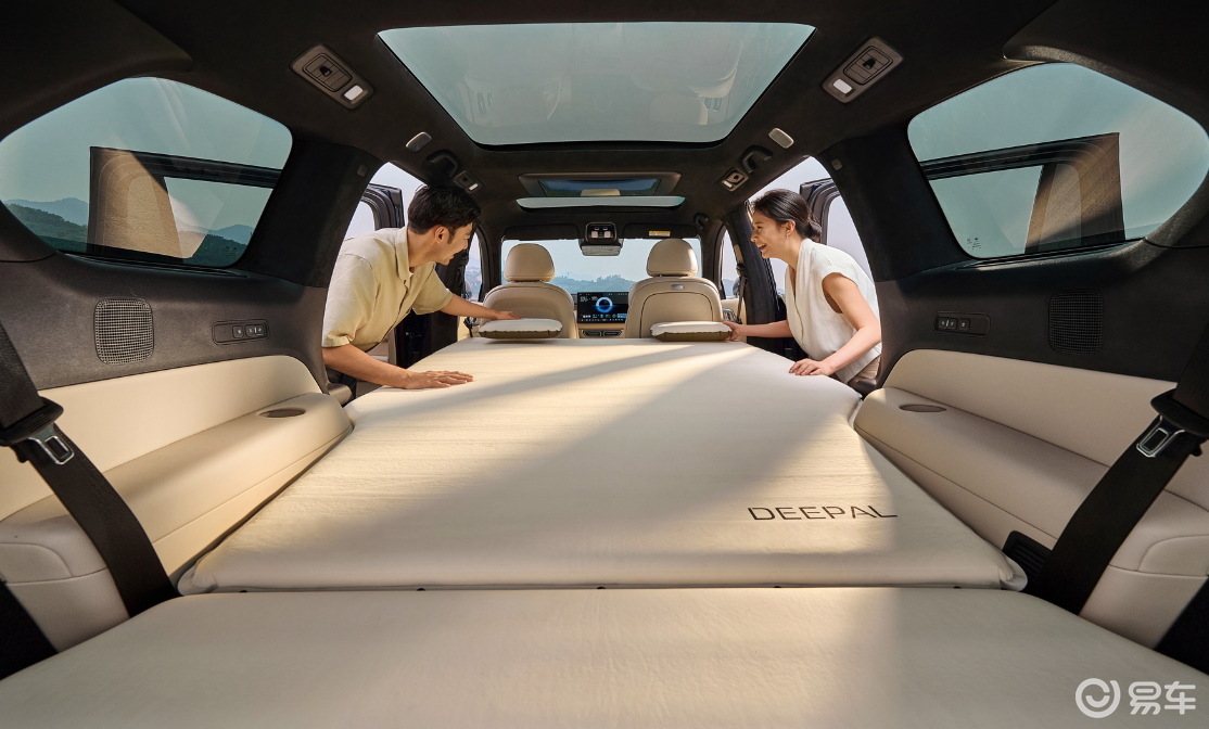 比如深蓝S09同级唯一的二排双零重力座椅,不仅支持加热、通风、按摩、前后移动,还支持左右横移,当二排两个座椅移到一起,再将前排座椅放倒,妥妥就是双人床。如果将后两排座椅放倒,则可以形成3.7米超长有效空间、4.3平方米纯平地板,加上头顶大天窗,这星空房可比酒店强太多了,要知道在旅游旺季,酒店价格上涨动辄上千,有深蓝S09不止省了酒店钱,还有别样新奇体验。