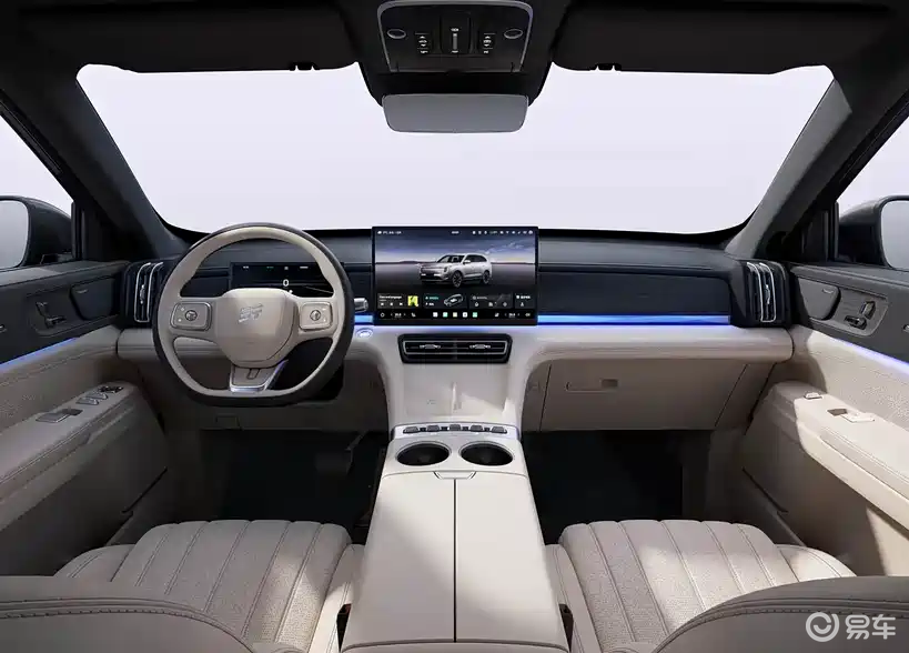 进入车内,捷途山海L7 PLUS给我的感觉是“坐得舒服,看的顺眼”。配色方面,米色和棕色的组合营造了温暖感,车门板和中控大面积软包,手感不错。夜间打开多色氛围灯,车内显得豪华而不浮夸。方向盘尺寸适中,皮质细腻,握感好;仪表盘不大,但清晰易读,开车时不用低头找信息。中控的15.6英寸大屏支持左右10°偏转,实际体验实用,比如副驾在查路线、调音乐时,屏幕转向自己更方便,不用探身操作。车机流畅度、分辨率都在主流水准,常用的导航、音乐、视频都能用。