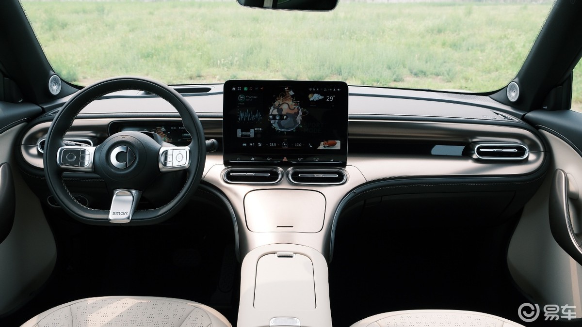 其次是smart精灵#1,不可否认它的内饰在设计层面确实更有层次一些,还有各种曲面元素的加持、小清新的颜色搭配、真皮材质的包覆、金属拉丝材质的加持,以及空调出风口周围都布满氛围灯的设计等等,都会让它的体验更出色更豪华一些,也会更容易俘获年轻小姑娘的芳心。如果说沃尔沃EX30 Cross Country的内饰就像是户外山林,那smart精灵#1的内饰就像是豪华酒店。