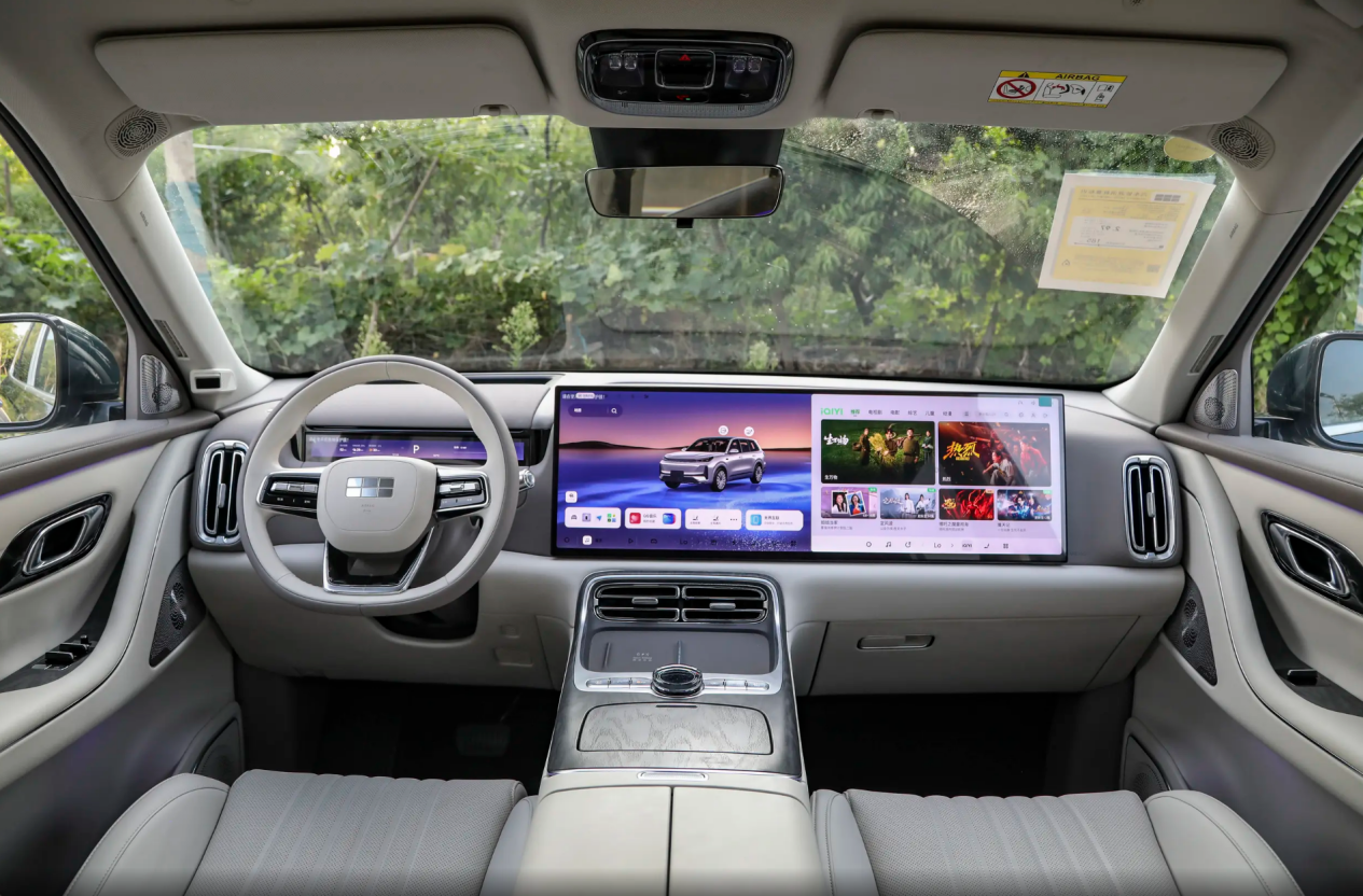 而吉利银河M9则是一步到位,直接把30英寸的6k一体式天际屏给安排上了。而且和其他连屏不同的是,银河M9的中控大屏整屏交互是没有断点的。这虽然避免了中间令人尴尬的黑边,但实际的成本还是很高的。看来这回吉利银河真是很下本了。