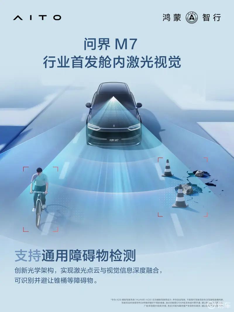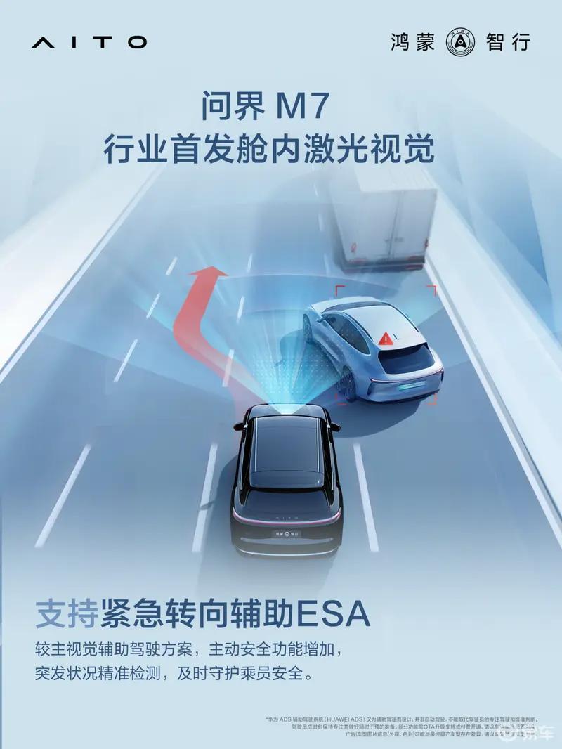 全新问界M7首搭舱内激光视觉方案,较主视觉辅助驾驶方案,主动安全能力更强,新增紧急转向辅助ESA,支持恶劣光线环境下的障碍物检测,可识别锥桶等障碍物。