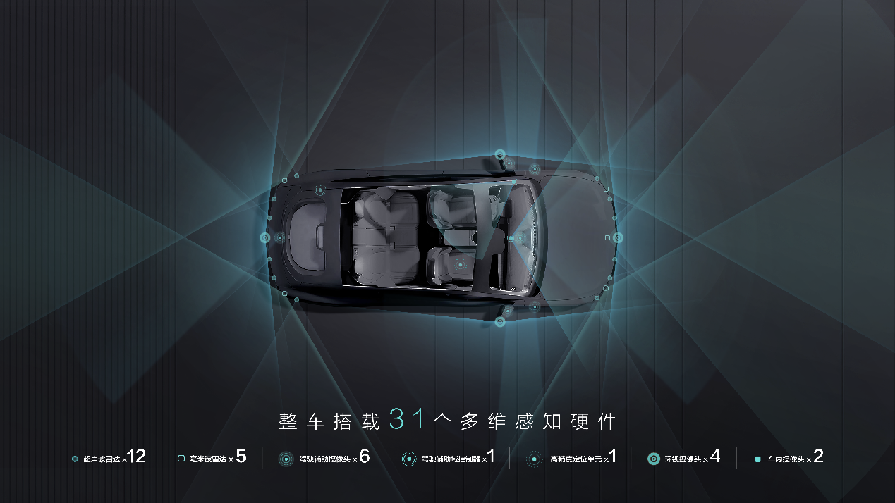 它还有非常丰富的主动安全功能,全车配备了31个多维感知硬件,包括6个驾驶辅助摄像头、4个环视摄像头、12个超声波雷达等,实现了全维勘测、无死角防护。有了强大的安全硬件加持,eπ007可实现高速NOA导航辅助驾驶、自动泊车入位、十字路口碰撞预警等多项高级驾驶辅助功能,为驾乘人员提供了全方位的安全防护。
