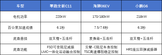 当然了,操控也不能只论加速,底盘也很重要。海狮06EV表现相对逊色一点,采用了麦弗逊+五连杆的悬架组合,其余2车都是双叉臂+五连杆的组合,更偏向于操控属性。不过功能上海狮06EV配备的云辇-C和TSC高速爆胎稳定控制还是有一定的看点,对于稳定性和安全性的提升都有帮助。零跑全新C11则是具备FSD可变阻尼减振和LMC一体化运动融合控制,除了高速爆胎稳定控制还拥有起步融合控制、动态转向辅助和高速预稳定控制功能。而小鹏G6则只有HRS液压回弹减振,在配置上还是差了点意思。综合咱们前面提到的价格来看,零跑全新C11显然更有诚意。