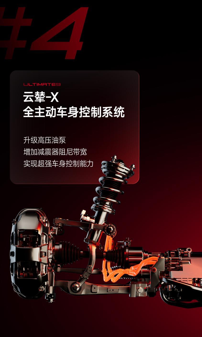 三是云辇-X智能全主动车身控制系统,这是全球首个高电压全主动悬架系统,可以实现垂直方向上的悬架快速调节,使车身更平稳抓地,保证车辆稳定性与安全。