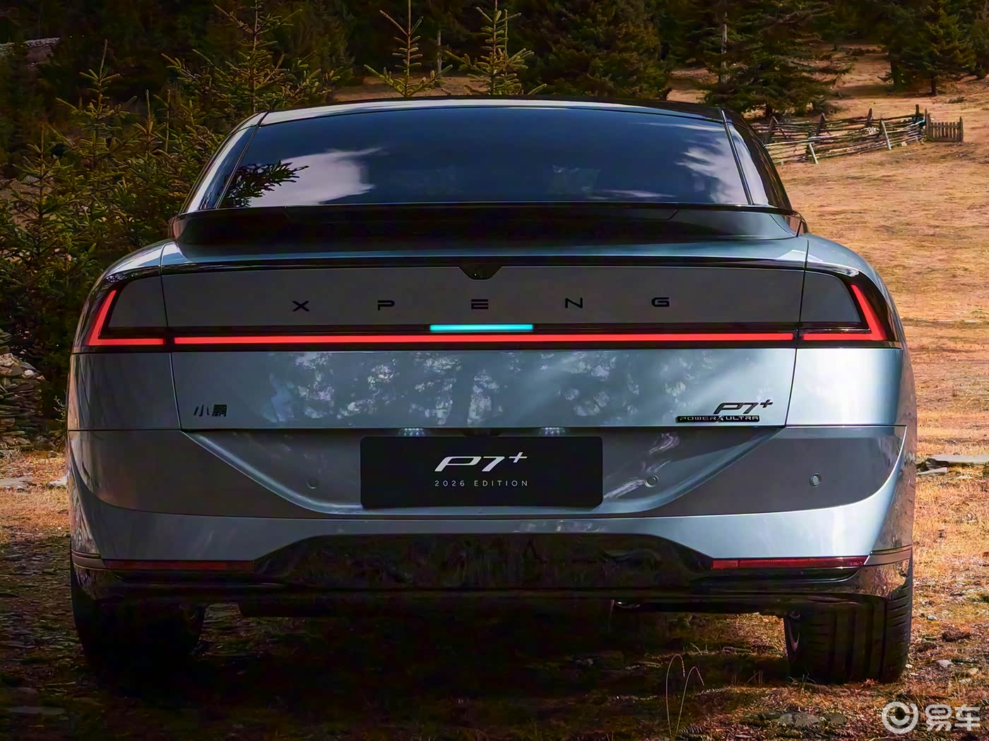 车尾部分,2026款小鹏P7+采用了双层尾翼设计,并换上了全新一体式星轨贯穿尾灯,点亮后极具辨识度。此外,新车还配备了宽大的后包围,两侧还集成有扁平的雾灯,整个尾部看上去很有层次感和立体感。