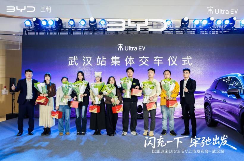 活动现场,资深媒体代表上台分享了宋Ultra EV的试驾体验,从专业视角解读新车的闪充优势、安全性能与驾乘感受,对其市场前景给予高度期待。随后,主办方举行首批车主交付仪式,比亚迪领导为首批车主交付鲜花、钥匙与专属礼品并合影留念,宣告宋 Ultra EV 在武汉正式上市即交付,开启江城纯电闪充出行新时代。