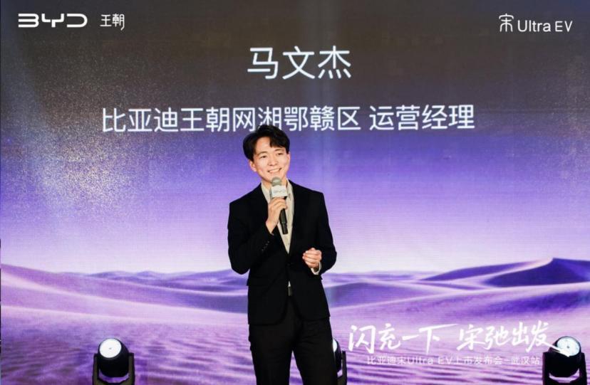 随后,比亚迪王朝网湘鄂赣区运营经理马文杰 对宋Ultra EV进行了全面解读,全方位展现新车的越级实力,让现场来宾直观感受这款新车的非凡魅力。