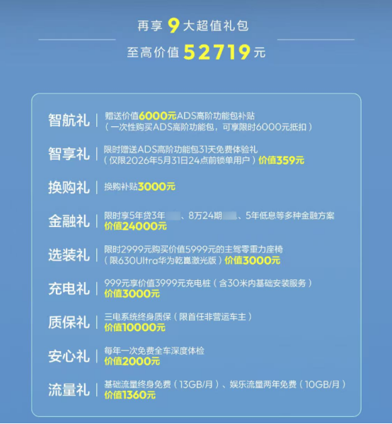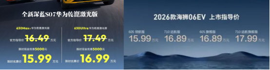 全新深蓝S07华为乾崑激光版新车上市两款,售价分别为16.49万以及17.49万,当下权益不错,现金优惠0.5万,限时优惠价分别为15.99万以及16.99万,并可再享有9大超值权益礼包,总价达52719元,而且还有6000块的ADS高阶功能包;26款海狮06EV指导价15.99-17.99万,选装激光雷达还要再加9900,但是可以享受一年的免费闪充权益。