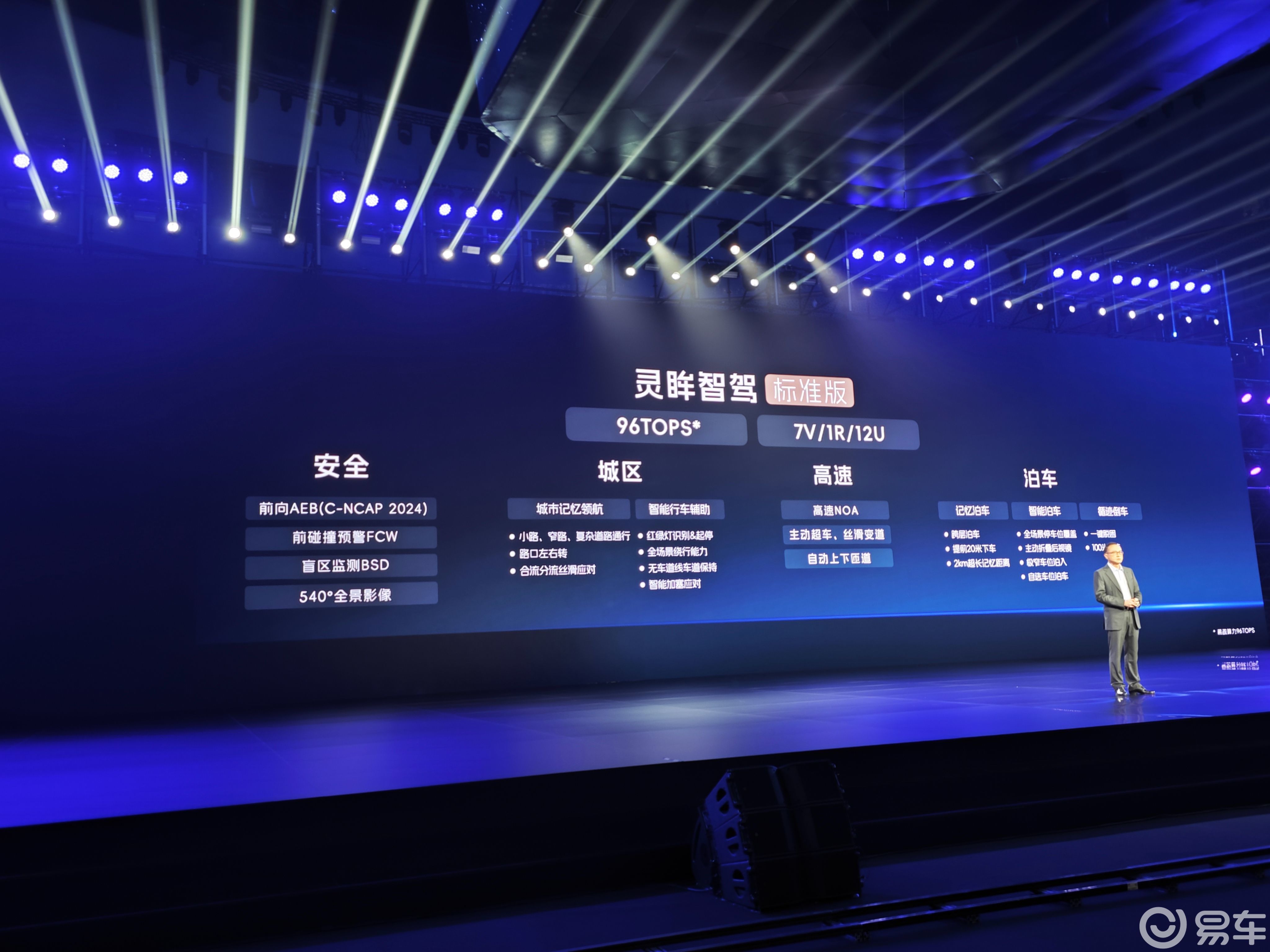 在灵眸智驾技术矩阵方面,其规划了四大层级,分别是基础版、标准版、进阶版和旗舰版,四大层级对车型进行覆盖。灵眸智驾基础版配备了前向AEB、车道偏离辅助、自适应巡航等功能。灵眸智驾标准版则多了高速NOA、智能泊车等功能,并且还标配了城市记忆领航和跨层记忆泊车功能,标准版配备了算力为96TOPS的芯片。
