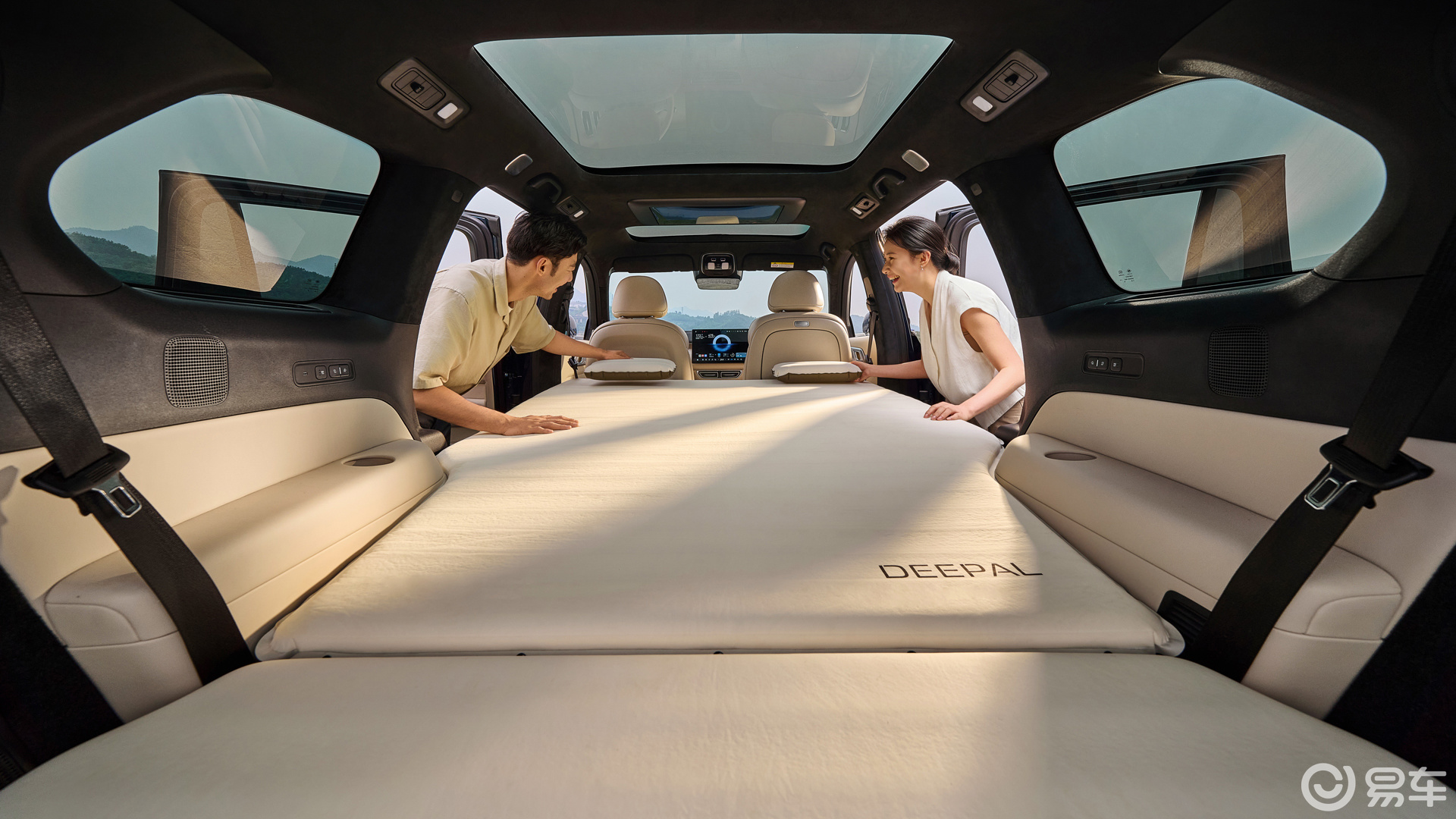 既然选择SUV肯定少不了带全家人自驾游,因此后备箱的空间同样重要。深蓝S09后备箱常规状态是427L,下面的暗格是44L,方便分割存放,可以放下7个20寸行李箱。而放倒后排达到了夸张的1392L!最重要的是它有多种组合,让你能得到5张床,其中最实用的就是1.9m观影床和2.5m露营床,自驾游露营的时候真的是非常爽!