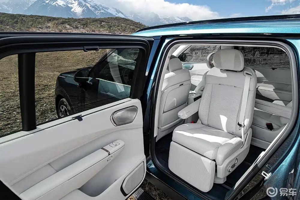 领克900二排前后移动量有550mm,不过最大腿部空间和深蓝S09还有一定的差距。好在第二排配备了180°电动旋转座椅,看上去非常的炫酷,不过这个旋转座椅静态才能用,开门能用,说实话这个功能更多还是炫技实用性不是很强,用个几次可能后面就很少用了。并且只有顶配车型才配备零重力座椅舒适,有了零重力座椅又没了旋转座椅。此外,冰箱也小了一点是9L的。