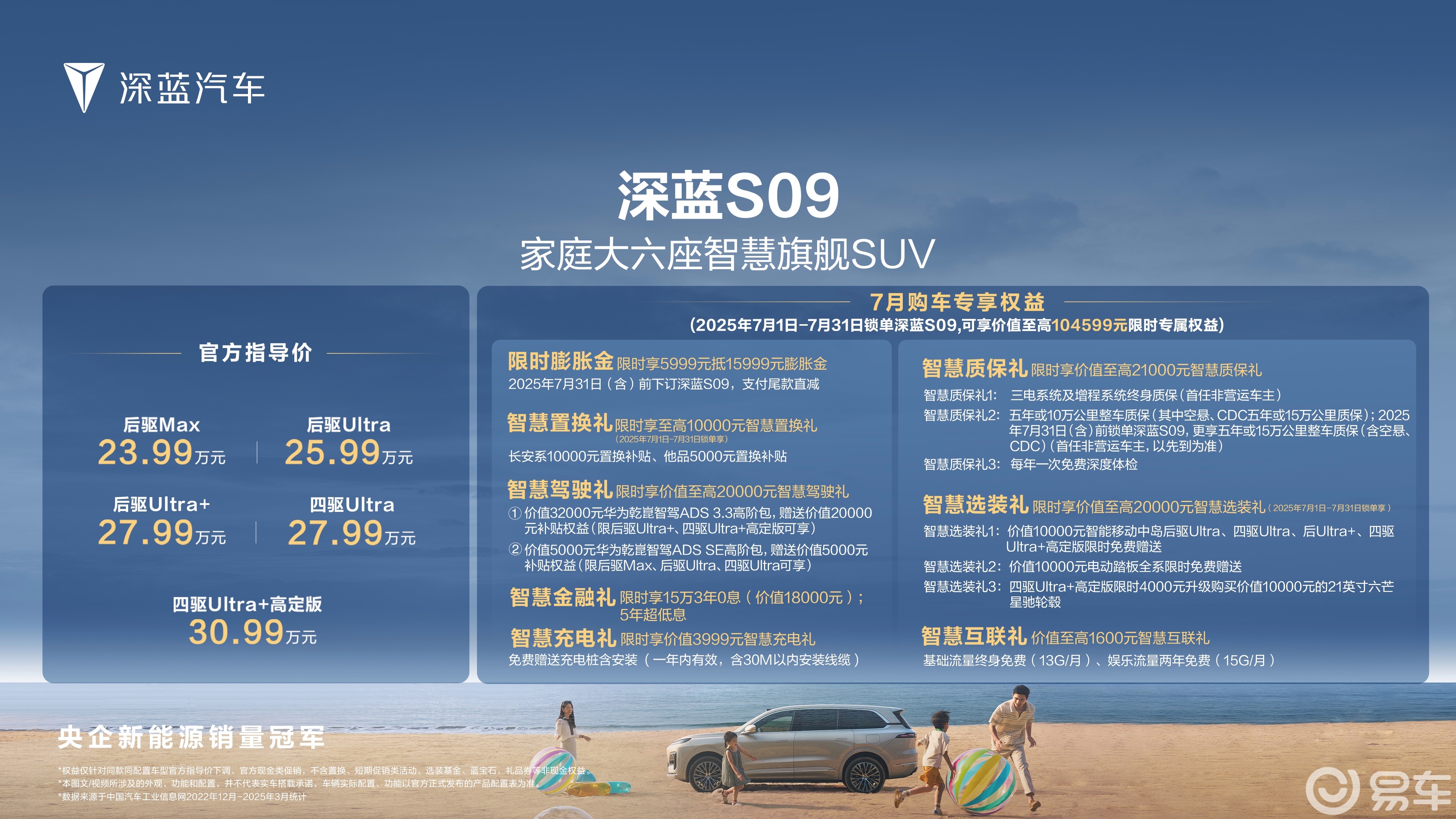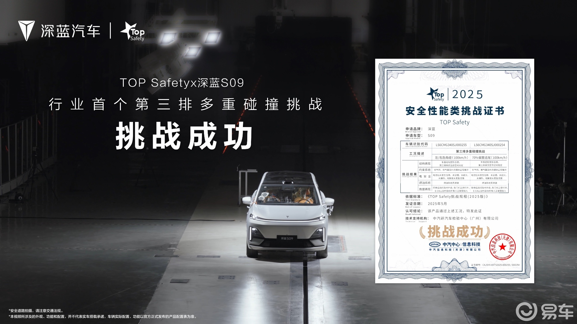 其实买车的重中之重还有安全性,被动安全方面,深蓝S09采用十三横五纵金刚车身;乘员舱为100%高强度钢;前防撞梁长度达到1636mm;而门槛CBS填充,32kph侧面柱碰,侧侵入量减少100mm;2700mm侧气帘,三排100%头部保护;全车12个安全保护点位,可以为每一位家人提供360度的周全保护。主动安全方面,搭载华为全向防碰撞CAS 3.0,可以实现前向主动安全;侧向主动安全;后向主动安全;误打方向盘时,主动锁死转向系统;识别误操作并主动干预,保障行车安全等等。5月23日,深蓝S09联合国家级权威检测机构中汽中心,完成了“行业首个第三排多重碰撞挑战”,这也是行业首个多重三个百公里时速的挑战。