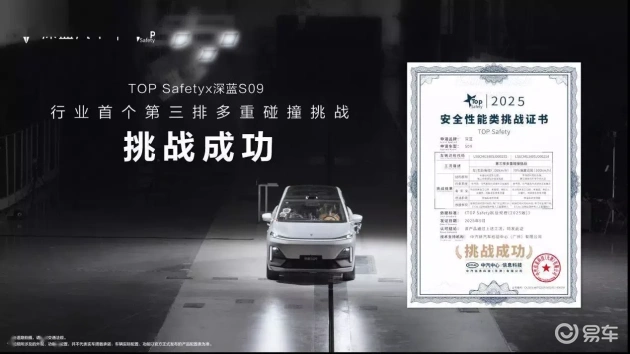 深蓝S09成功完成了行业内首次的第三排多重碰撞挑战,以远超国家标准的测试标准顺利完成。例如,以100km/h的速度进行碰撞试验,极限挑战超高速第三排追尾,撞击能量是全球最严苛尾部碰撞试验标准的1.56倍。相信这种三排安全性能将比问界M8更为出色。