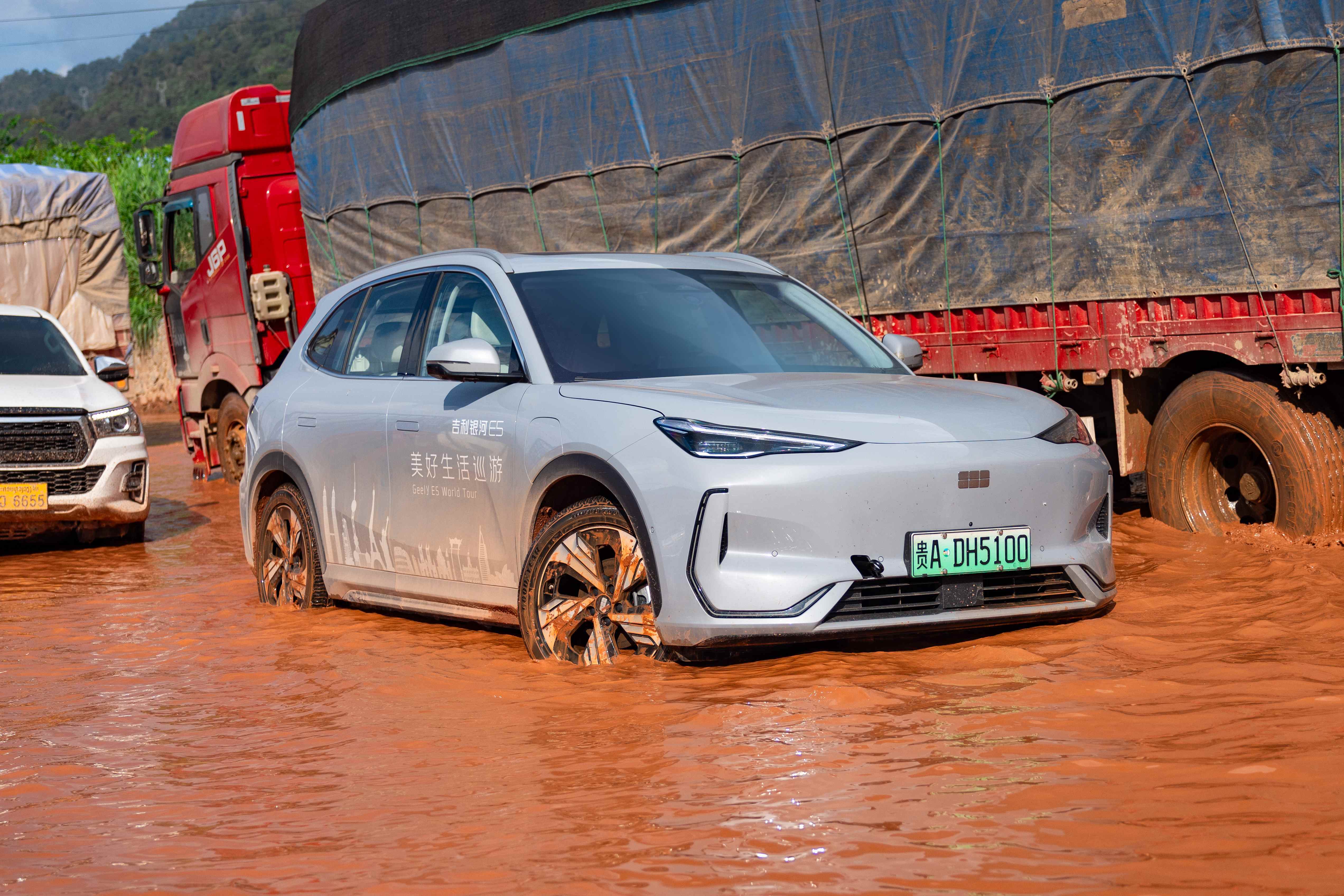 2024年9月,10辆吉利银河E5跨越四国到达马来西亚,全程3725km。途径老挝时,车队遇到百年一遇的洪涝灾害,有些地方水深超过30cm,还是具有腐蚀性的黄泥。吉利银河E5车队仍然全部顺利、安全通过洪涝区域,并且继续行驶2000多km,最终抵达吉隆坡。