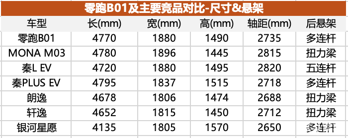 悬架方面,零跑B01全系坚持了多连杆的独立后悬架,虽然规格比不上秦L EV的五连杆,但相较目前最畅销的MONA M03,独立后悬已经算得上B01的一个加分项。