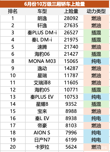最后我们再把10万元左右所有动力类型的三厢轿车汇总,MONA M03也只能排在第八名,Top 20里总计只有5款纯电,朗逸、轩逸、星瑞等燃油车销量规模占了一半,插混、燃油车月销过2万辆的,总计达到了6款。