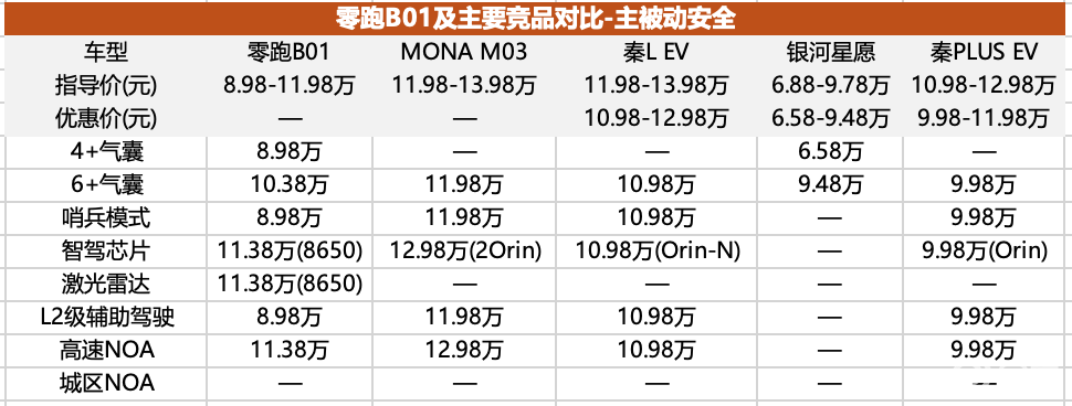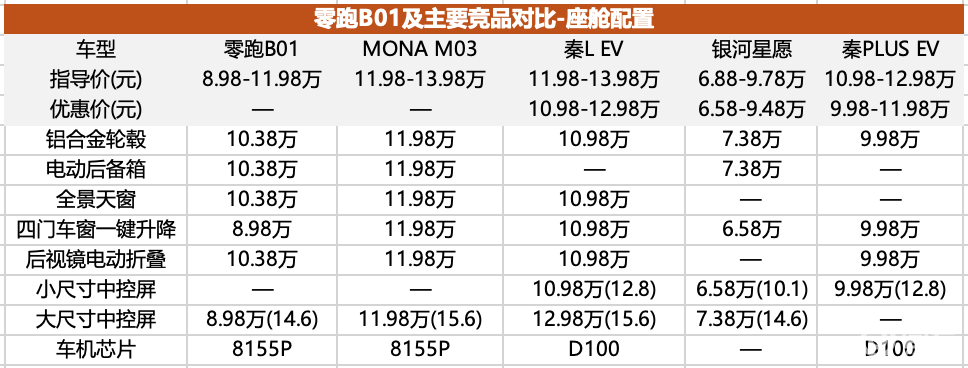 明确了零跑B01锁定的主要目标,我们再看看它和这些竞品在功能配置上的表现。