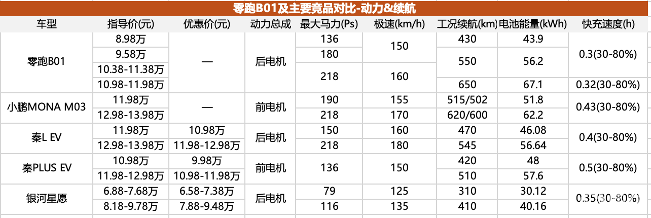 这也就是说,零跑B01的动力、续航版本看起来似乎有点过于复杂,但其实是考虑到了星愿们这样的电动小车、秦PLUS EV,以及10万元以上MONA M03这三波竞品。
